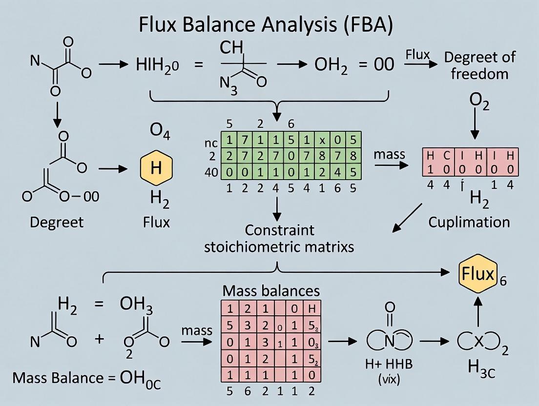 FBA defines a system of linear constraints: ( S \cdot v = 0 ), where ( S ) is the ( m \times n ) stoichiometric matrix, and ( v ) is the flux vector. ( \alphai \leq vi \leq \beta_i ), defining lower and upper bounds for each flux.